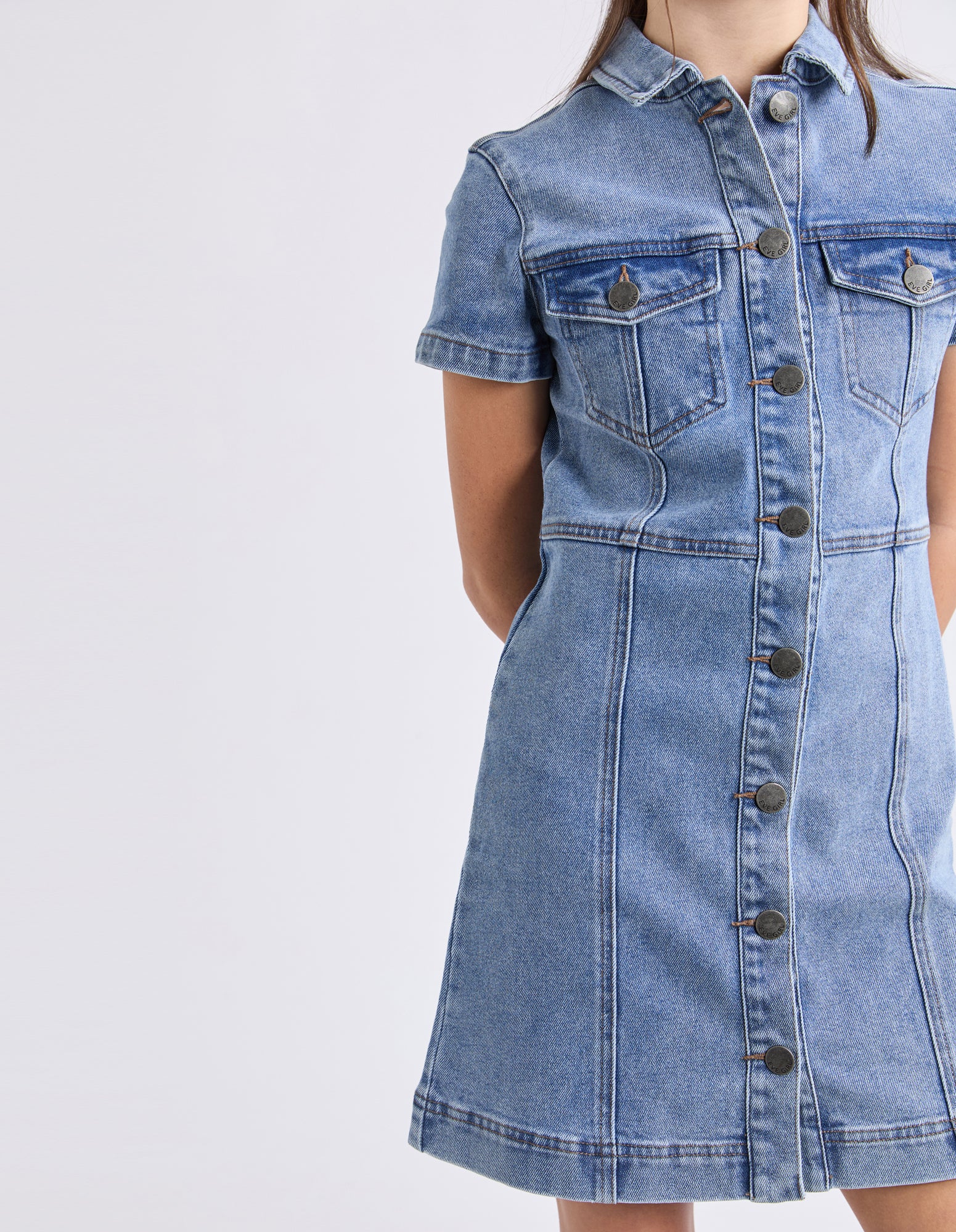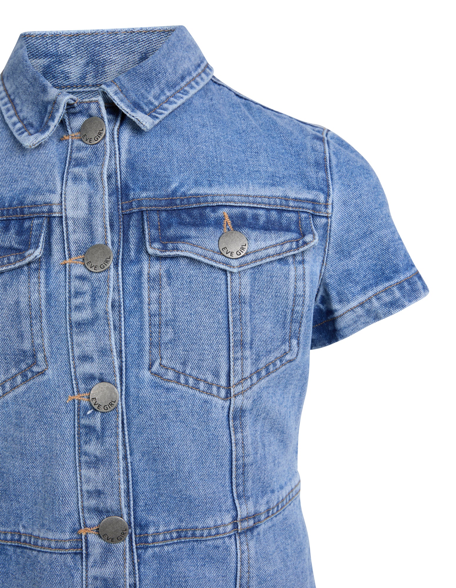 The Jenny Denim Dress by Eve Girl is the perfect denim dress for this summer. The dress in a classic denim colour, features contrast stitching and is a comfortable shape for everyday wear. It has self-fabric collar and front chest pockets, creating a timeless denim dress for any occasion.