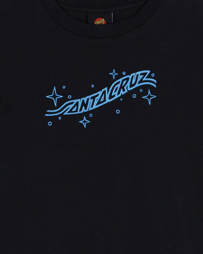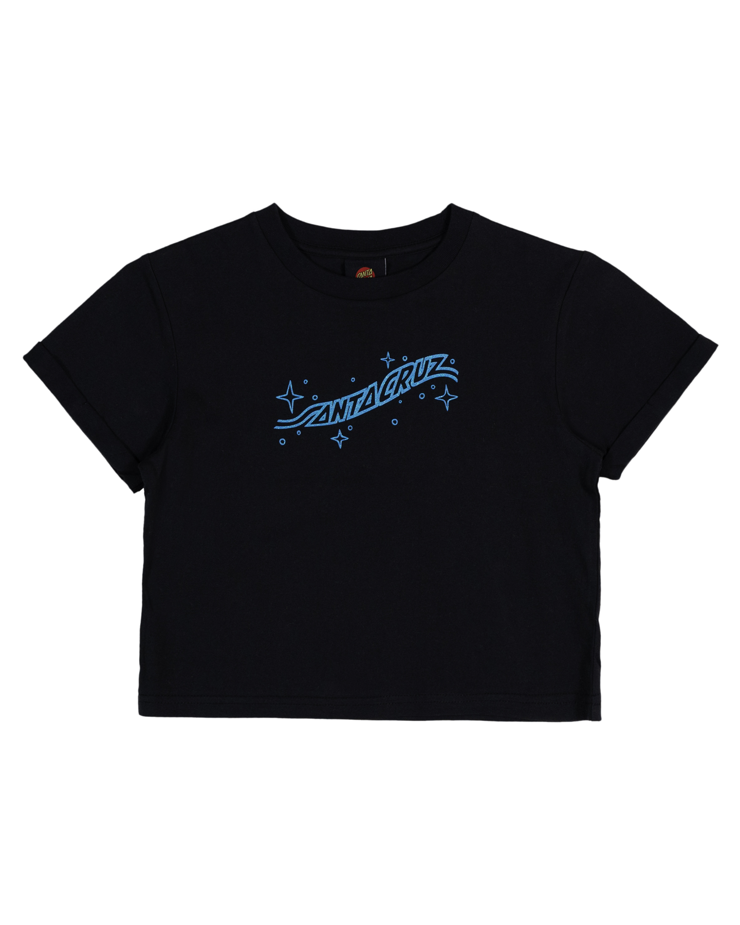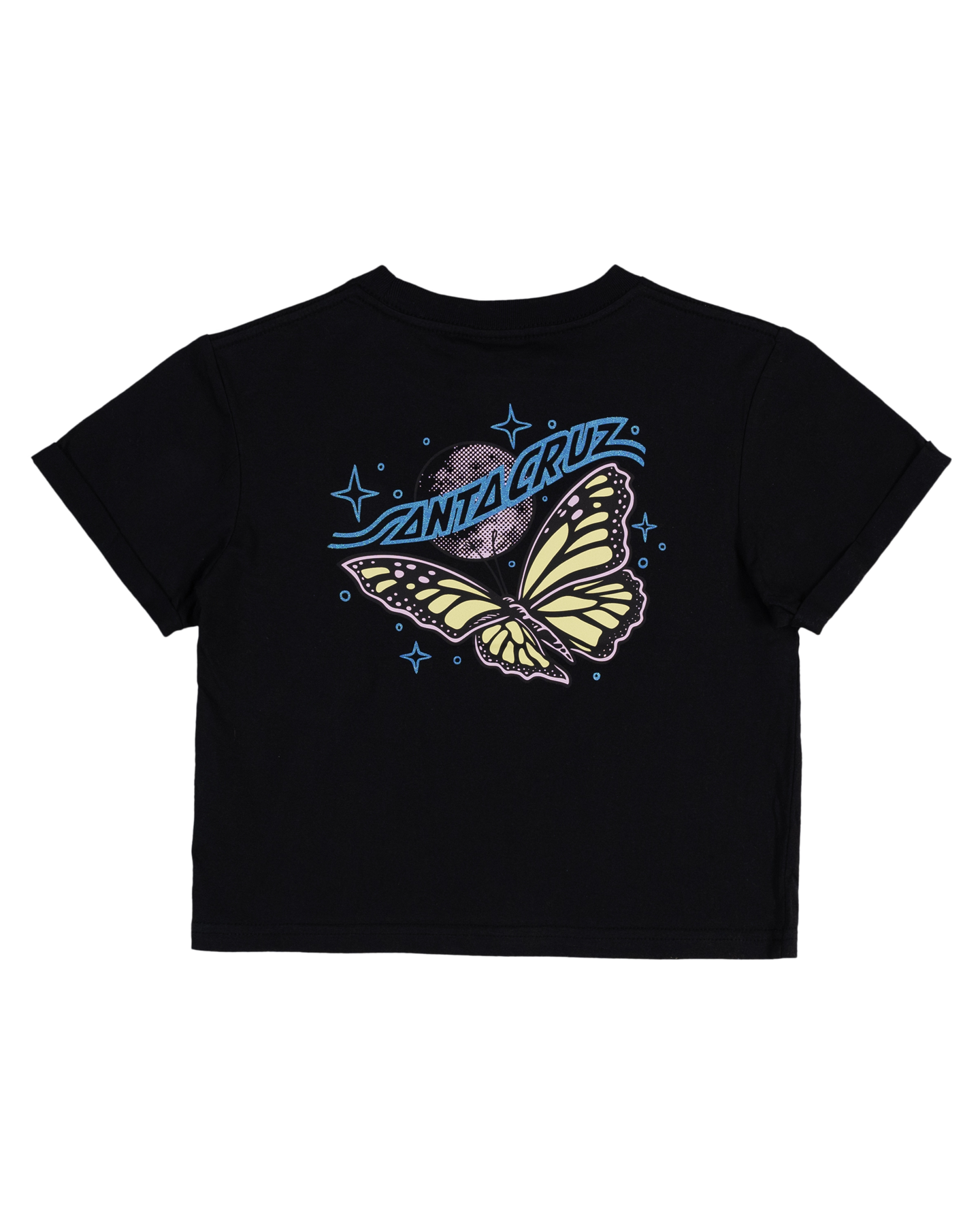 Girls Santa Cruz cuffed short sleeve cropped t-shirt featuring glitter screen print of the Winged Moon Strip artwork.