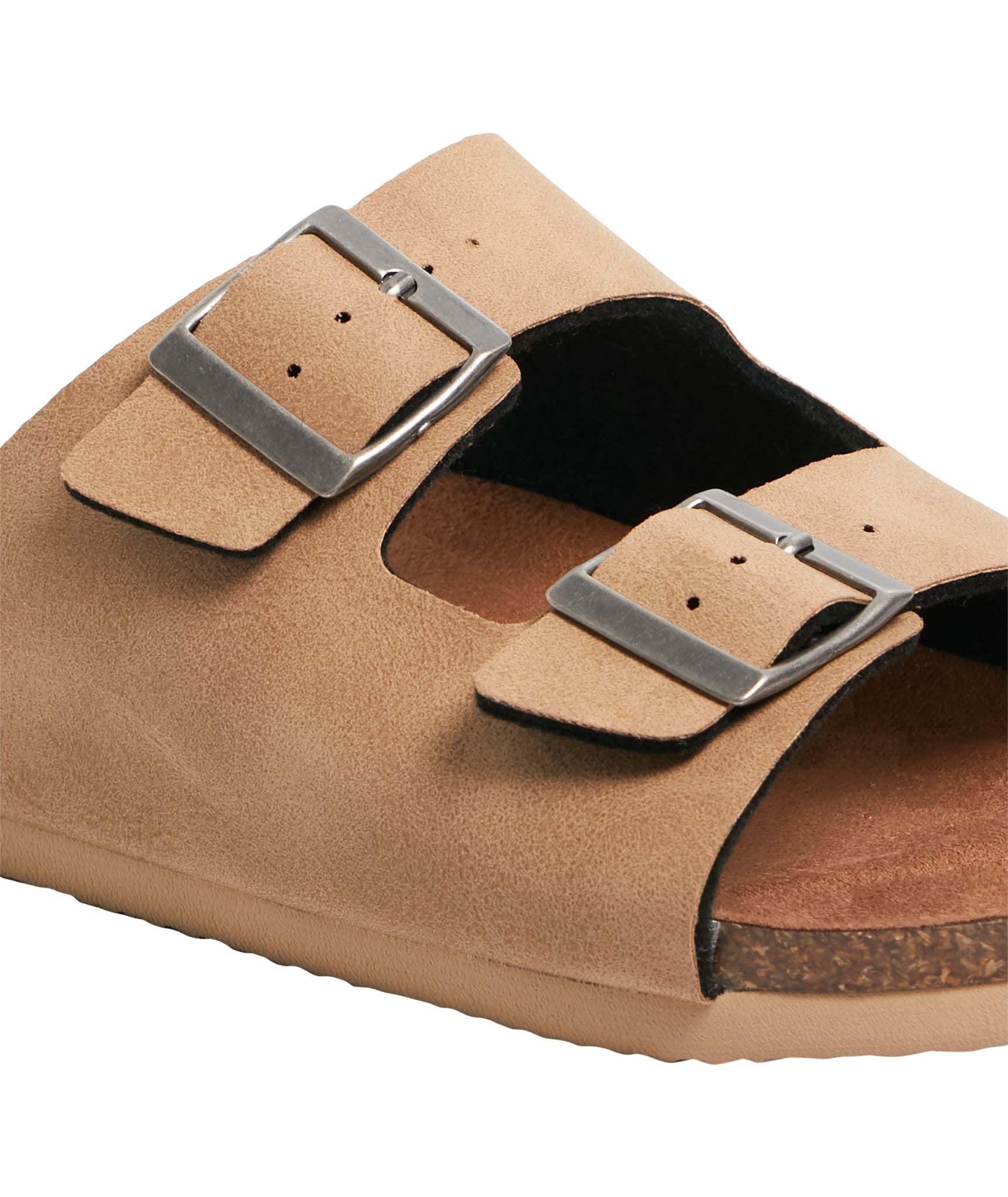 The Kustom Womens Duo Slide Sandal in Natural is an everyday essential with it's easy slip on design and a Traditional Ergonomic footbed with two adjustable buckle straps. Vegan leather upper. Fibre lined cork like footbed with rubberised EVA outsole.