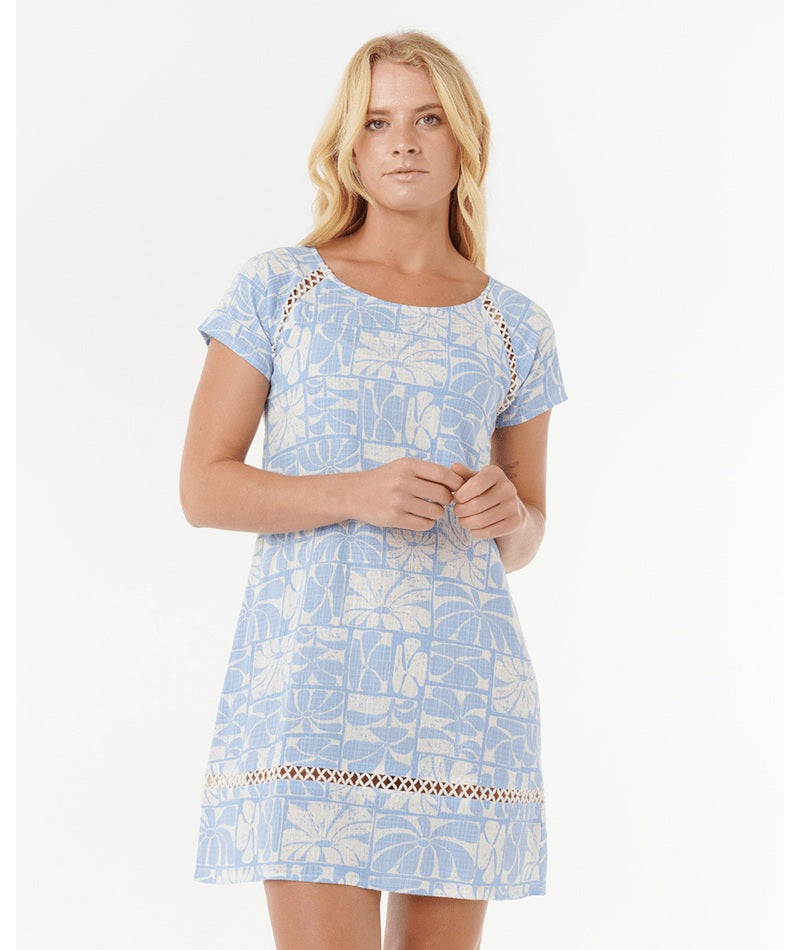 The Artist Of The Search - Ty Williams Shift Dress combines a cotton and Lenzing™ Ecovero™ viscose blend with a softener wash for softness and durability. Featuring an all-over yardage print, crochet trim detail, and metal logo trim, it radiates relaxed bohemian surf style.