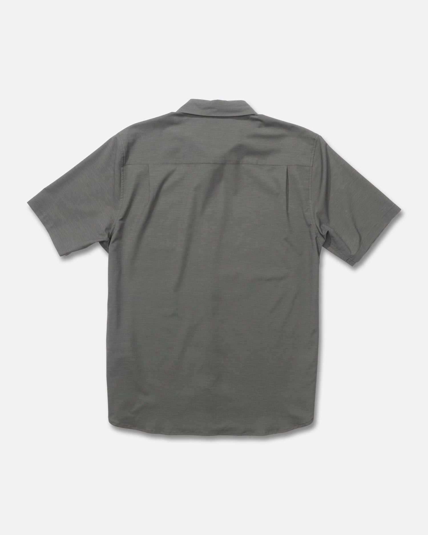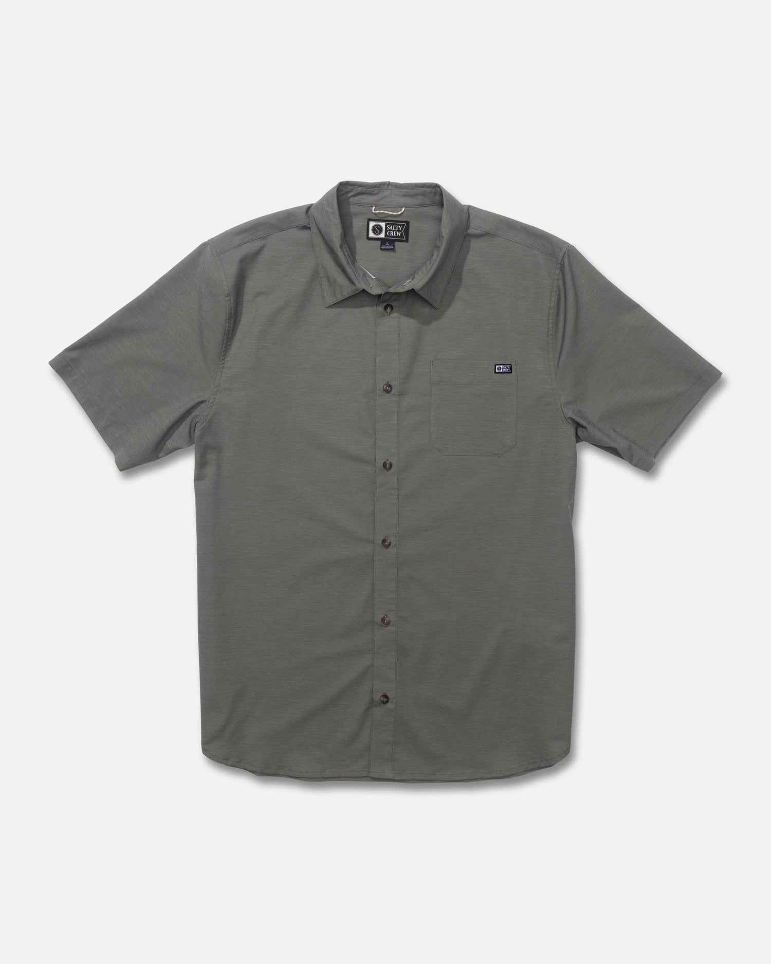 The Drifter UV Button-Up Shirt in Olive is made from a polyester/cotton/elastane blend for durability and stretch. It features a woven chest label, Salty Crew branded resin buttons at the center front, and a lightweight, breathable construction.