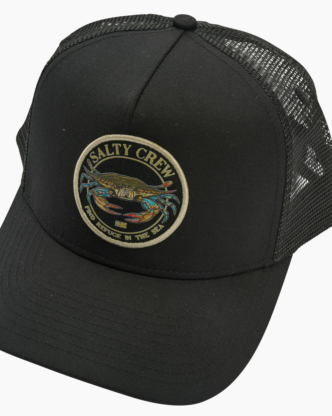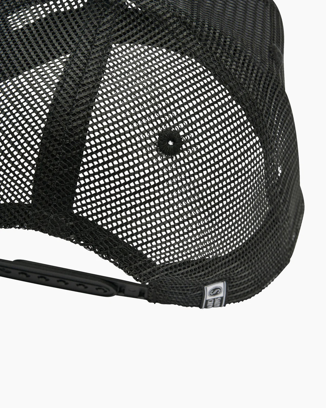 The Jimmy 5 Panel Trucker Cap in Black is a structured 5-panel, mid-crown height trucker cap. Made from cotton canvas and 100% polyester mesh, it features a cotton patch with transfer print and merrowed edge at the front, a moisture-wicking sweatband, and a plastic snapback closure at the back.